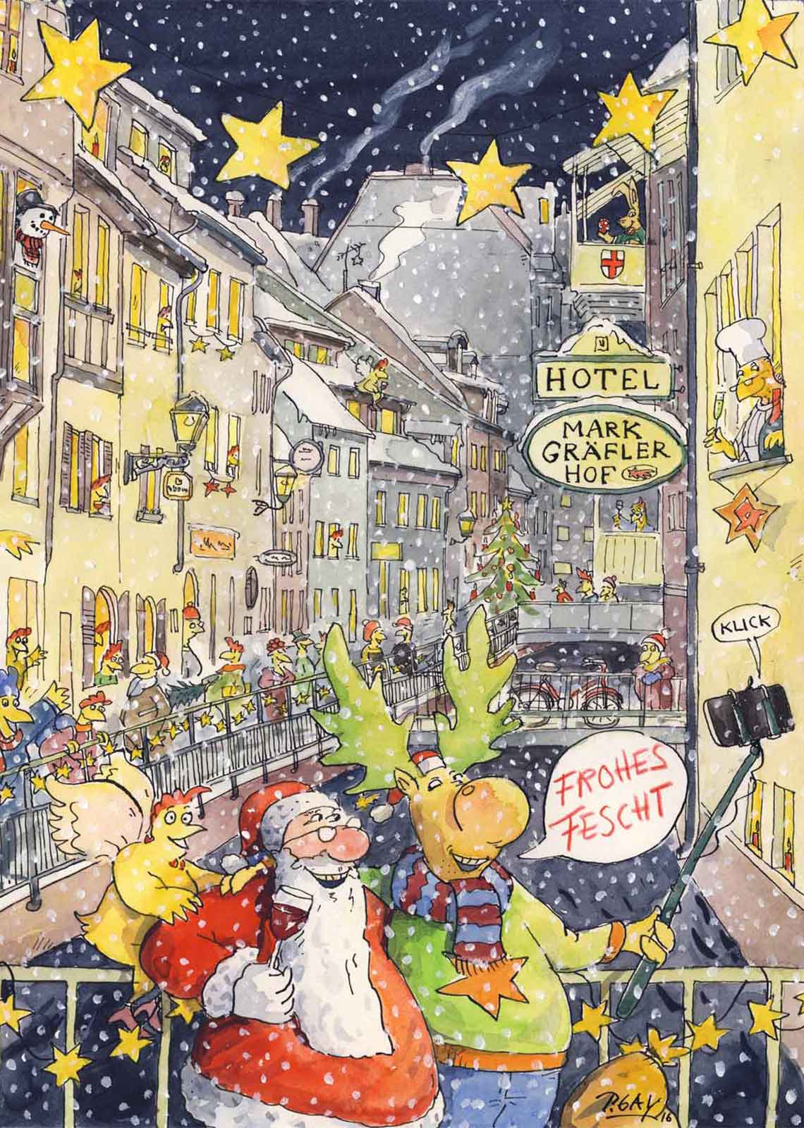Das Freiburg-Motiv wird jedes Jahr vom bekannten Huhn-Cartoonisten Peter Gaymann entwickelt.